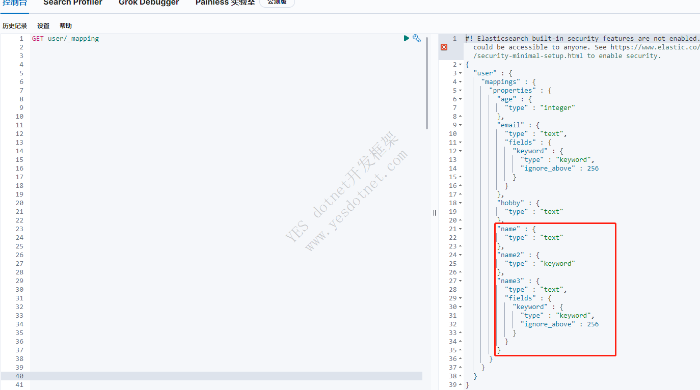 创建索引的时候我上面故意创建了name(text),name1(keyword),name2(text+keyword),然后数据类型也说了text,keyword是ES的重点类型,这里演示他们的区别。