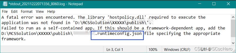 如图,日志显示缺失了runtimeconfig.json以及deps.json文件。