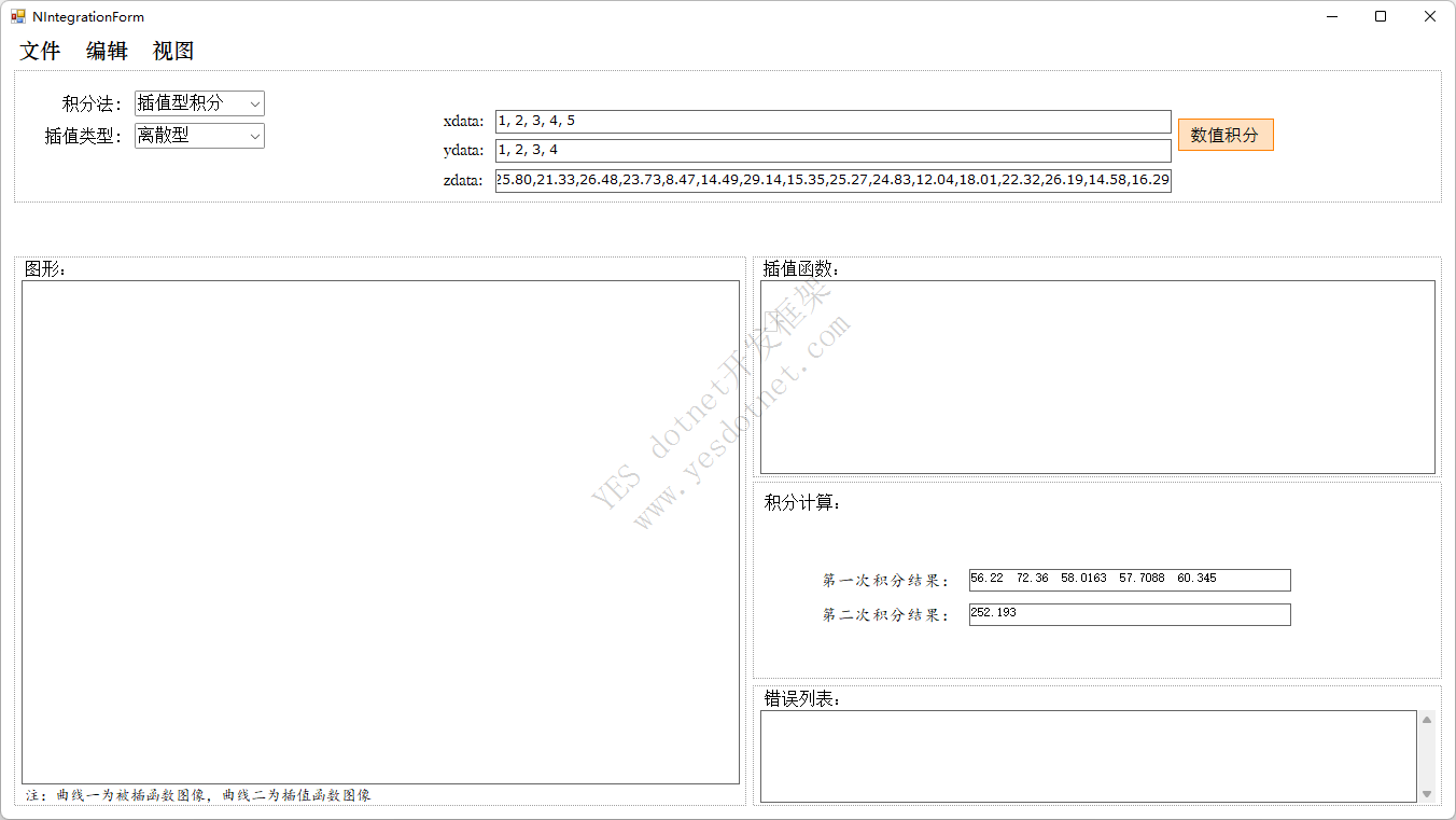 其中,$f\left ( x_i,y_j \right )$为$\left ( x_i,y_j \right )$处表格中的值,$\sigma _i\left ( x \right )=\left ( x-x_0\right )\cdots \left ( x-x_{i-1}\right )\left ( x-x_{i+1}\right )\cdots \left ( x-x_m\right )$,$\omega _j\left ( y \right )=\left ( y-y_0\right )\cdots \left ( y-y_{j-1}\right )\left ( y-y_{j+1}\right )\cdots \left ( y-y_n\right )$。这里我使用c#编程语言使用WinForm连接Mathematica来设计算法: