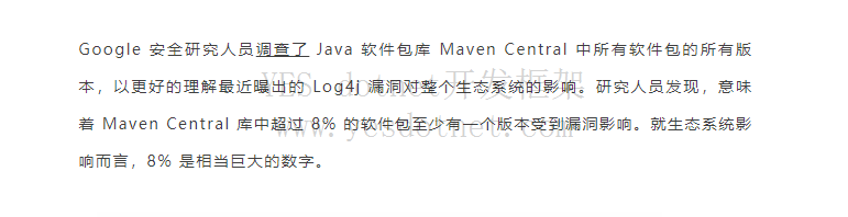 最近Log4j漏洞事件影响比较广泛,不管有没有被攻击,都是潜在的风险。研究发现Maven库中超过8%软件包至少有一个版本受到漏洞的影响。