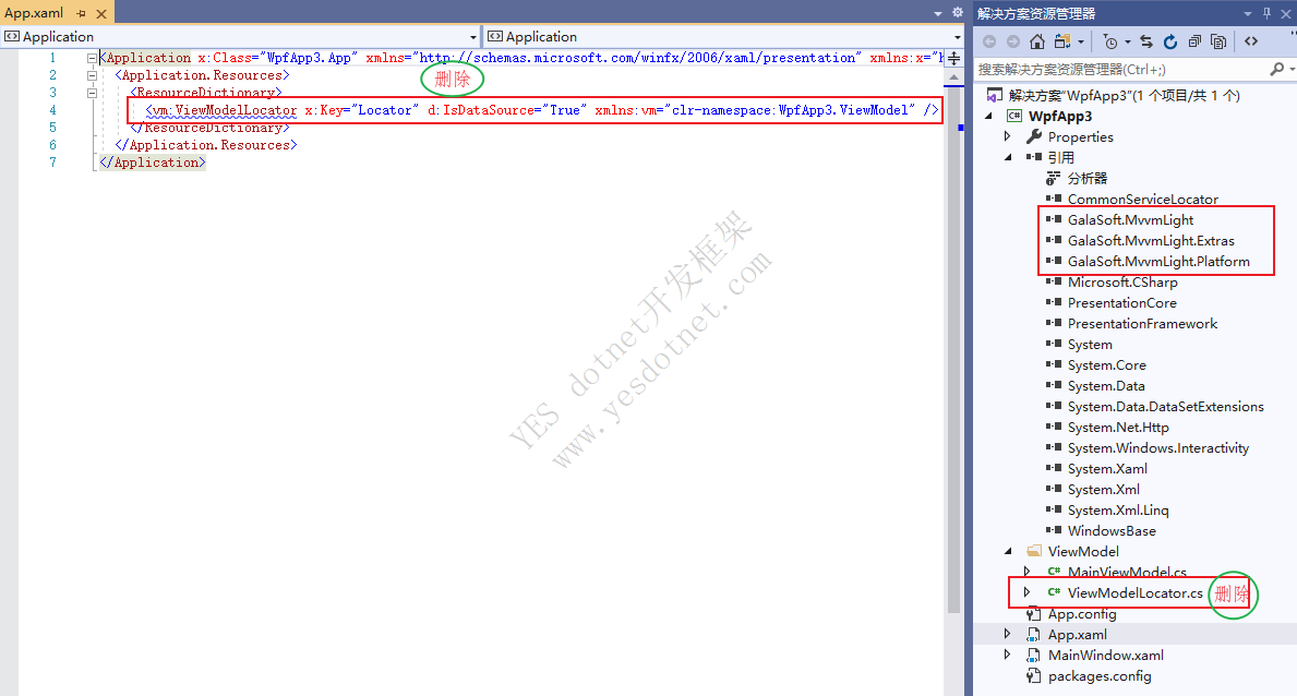 MvvmLight安装成功后,自动引用需要的第三方库,并默认生成示例内容,有些不需要的需要删除,如下所示: