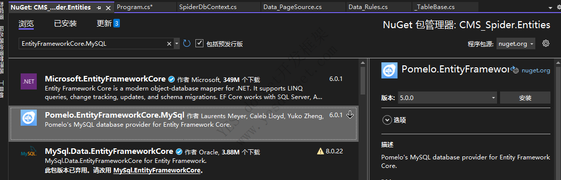 MySQL包引用名称为:EntityFrameworkCore.MySQL